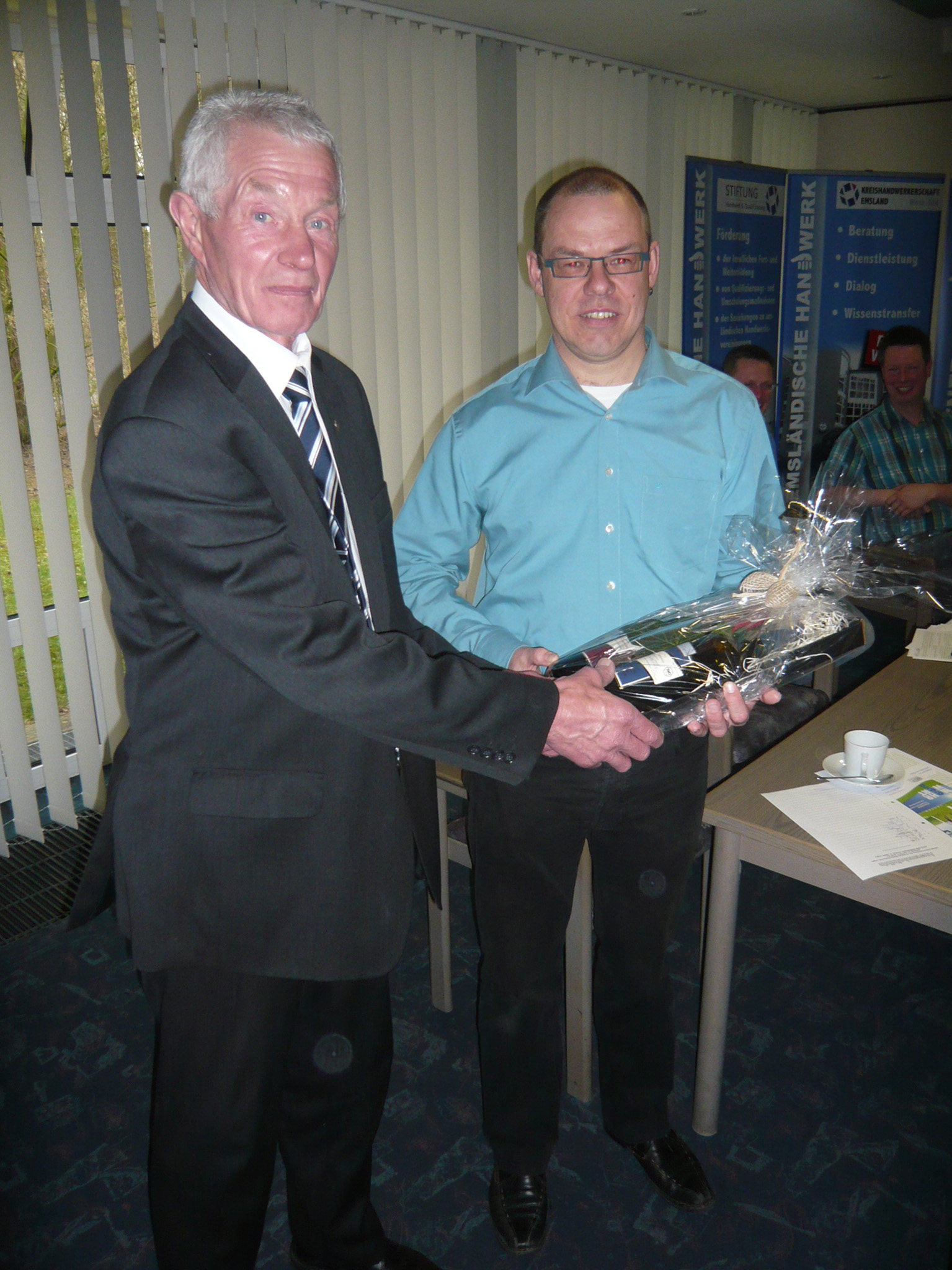 Interessiert lauschten die Mitglieder der Innung Gravels Ausführungen, die ihnen Möglichkeiten zum effektiven Einsparen von Energiekosten aufzeigte. „Ziel der Energieeffizienzagentur ist es, die Energieeffizienz klein- und mittelständischer Unternehmen zu steigern und damit den CO2-Ausstoß im gesamten Landkreis Emsland zu reduzieren“, so Gravel über die Intention der Agentur. Von zentraler Bedeutung sei es dabei, vor allem das entsprechende Bewusstsein dafür zu schaffen und Unternehmen über Energiesparpotentiale und individuelle Lösungen aufzuklären. Im Blickpunkt einer Analyse stehen dabei die Verbräuche von Licht, Gas, Heizung und Druckluft. So könne beispielweise mit der Optimierung bestehender Heizanlagen bei einer zu beheizenden Fläche von 400 Quadratmetern jährlich zehn Kilowattstunde pro Quadratmeter und damit 200 Euro eingespart werden. Auch das Klima profitiere davon: Bis zu 976 Kilogramms weniger CO2 würden dank dieser verhältnismäßig simplen Maßnahme in die Atmosphäre ausgestoßen. Bei dem Faktor Druckluft ließe sich laut Gravel sogar noch mehr einsparen. „Durch Undichten und die dadurch ausströmenden Luftmengen werden nach 4000 Stunden bis zu 1200 Euro und fünf Kilo CO2 einfach in die Luft geblasen“, rechnet Gravel vor. Eine weitere, äußerst effektive Maßnahme seien Blockheizkraftwerke (BHKW`s). Diese optimierten den Wärmekreislauf von Gebäuden durch den Einsatz von Erdgas. Die in Lingen ansässige Bäckerei Lüttel zum Beispiel konnte mit diesem Konzept fast 10000 Euro im Jahr einsparen und wurde dafür vom Institut für angewandte Energieeffizienz beim bundeweiten Wettbewerb „Grünes Haus“ mit dem ersten Platz ausgezeichnet. „Insgesamt sind die Energieeinsparpotentiale sehr hoch. Bis zu 70 Prozent Energie können beispielsweise bei der Beleuchtung eingespart werden, 50 Prozent bei Druckluft und 30 Prozent bei der Wärmeversorgung und den Pumpensystemen“ zieht Gravel Resümee. Obwohl Unternehmen durch entsprechende Maßnahmen dermaßen viel Geld sparen könnten und mit Fördermitteln unterstützt würden, ginge der Energiewandel nur langsam von statten. Dennoch sieht er das Emsland als Startpunkt für den Wandel und setzt dabei vor allem auf die Nutzung erneuerbarer Energien.